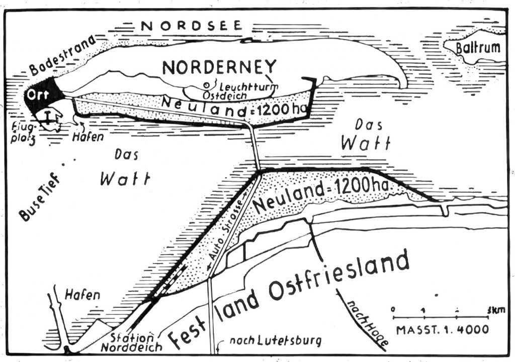 Wie hätte sich Norderney entwickelt, wenn in den 1920er Jahren der kühne Plan eines Eisenbahndamms von Hilgenriedersiel direkt auf die Insel Realität geworden wäre? Der Rhythmus der Gezeiten hätte seine Bedeutung für die Anreise verloren. Züge voller Urlauber wären unabhängig von Ebbe und Flut bis an den Strand gerollt. Der Massentourismus hätte viel früher völlig andere Dimensionen angenommen. Der Zauber der insularen Abgeschiedenheit wäre für immer einer eisernen Nabelschnur zum Festland gewichen.